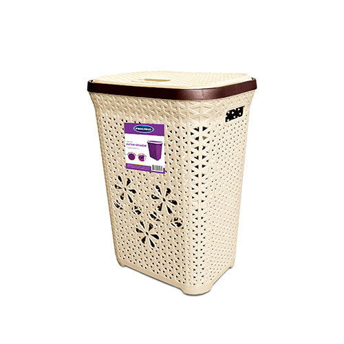 Cesto con acabado tejido tipo ratán, la tapa tiene un sistema tipo bisagra y cuenta con agarre para una fácil apertura. Tapa y cuerpo calado para la ventilación del contenido y asas para fácil traslado.